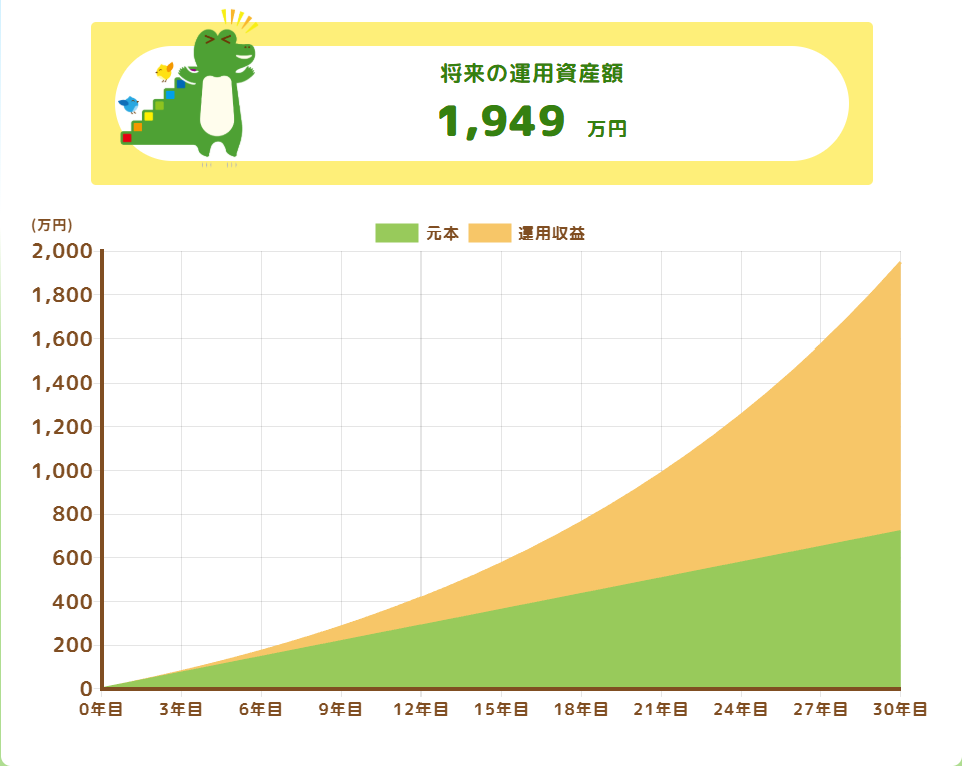 毎月2万円を30年続けるだけでも投資元本は720万円(実際の入れたお金)が福利の力で1229万円増え、老後2,000万円問題を解消する力となります。